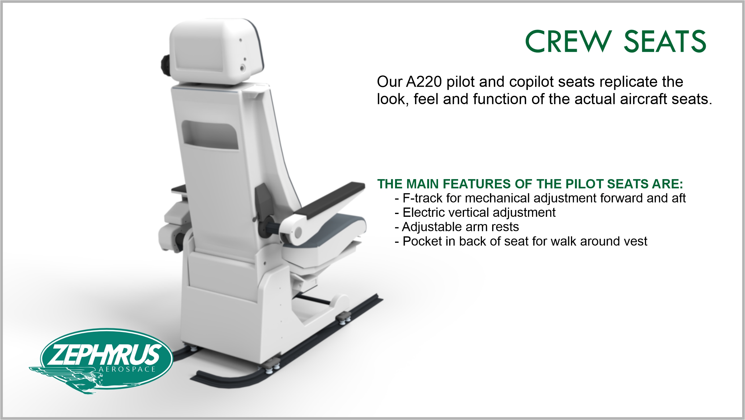 The Zephyrus Aerospace Airbus A220 Flight Simulation Training Device is a 1:1 replica of the actual Airbus A220 flight deck with fully operational controls and systems that behave as in the actual aircraft through all phases of flight including normal, abnormal and emergency conditions.